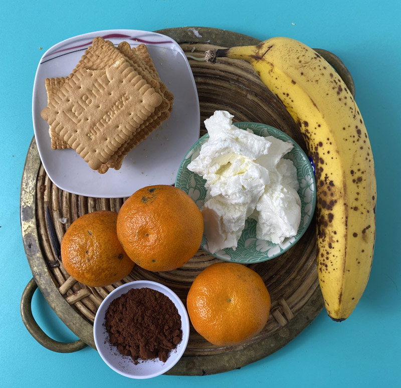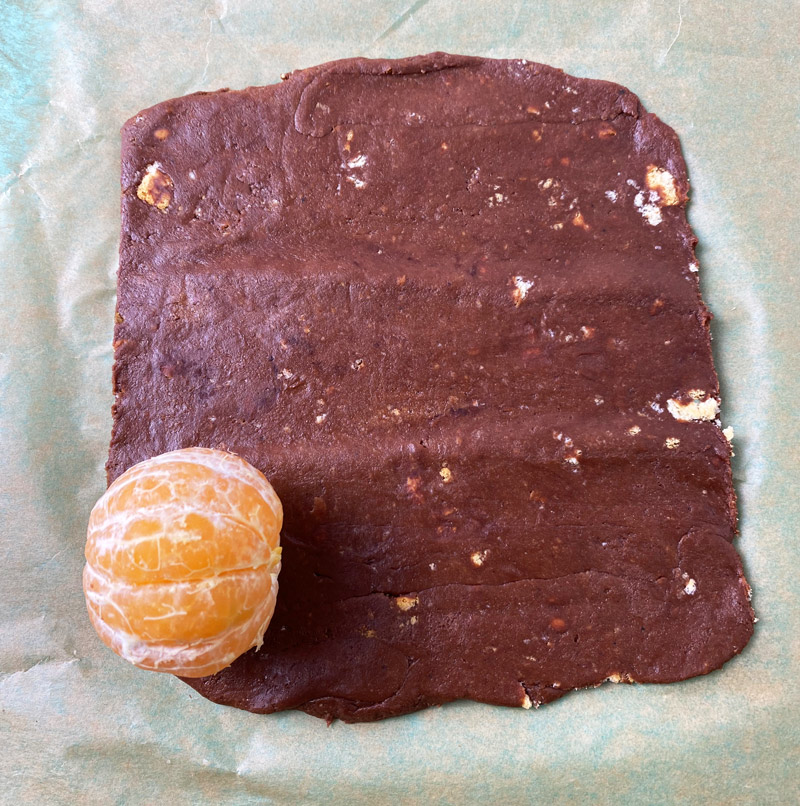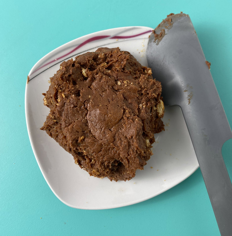 100 г печенья измельчить в блендере, добавить какао и банан. Измельчить до однородной массы. Если «тесто» получилось слишком жидким, добавить еще печенья. Одно из них можно покрошить руками, чтобы в однородной смеси были кусочки. Тесто не должно крошиться, но должно быть достаточно плотным, чтобы его можно было раскатать.