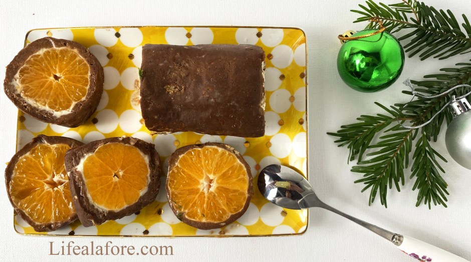 Тесто смазать слоем творога. Творог должен быть пастообразным. Если творог сухой или крупинчатый, его можно протереть и развести сметаной. Поверх творога вдоль теста выложить мандарины, сколько поместится. С помощью листа, на котором лежит тесто, скатать плотный рулет. Торцы рулета смазать творогом и плотно обернуть его бумагой со всех сторон. Положить в холодильник на пару часов.