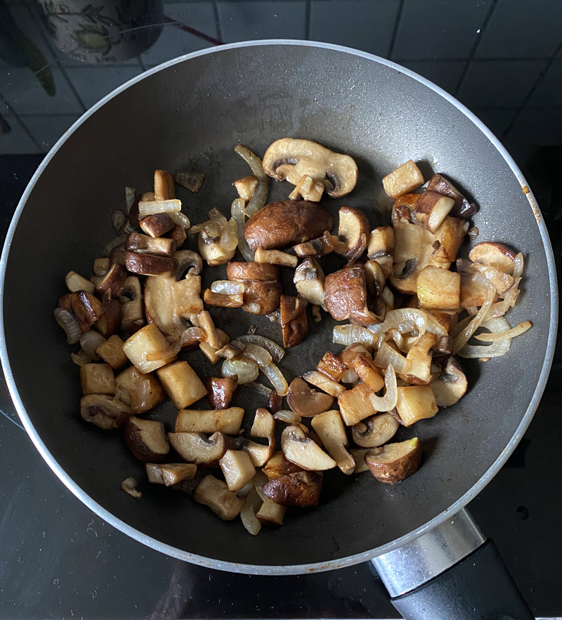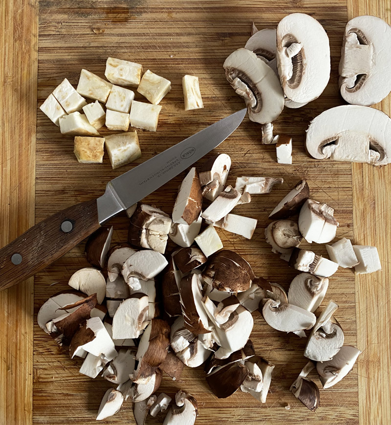 Корень сельдерея очистить. Шампиньоны тщательно обтереть салфеткой. Сельдерей и грибы нарезать кубиками около 1 сантиметра. Если вы хотите украсить блюдо при подаче, добавьте еще 2-3 гриба, нарезанных крупными ломтиками. Лук мелко нарезать.