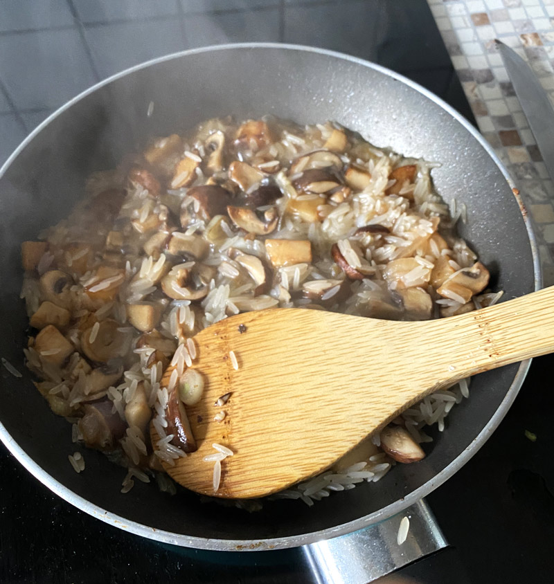 Вынуть из сковороды ломтики грибов, предназначенных для украшения. Положить в сковороду рис и потушить еще пару минут, перемешивая.